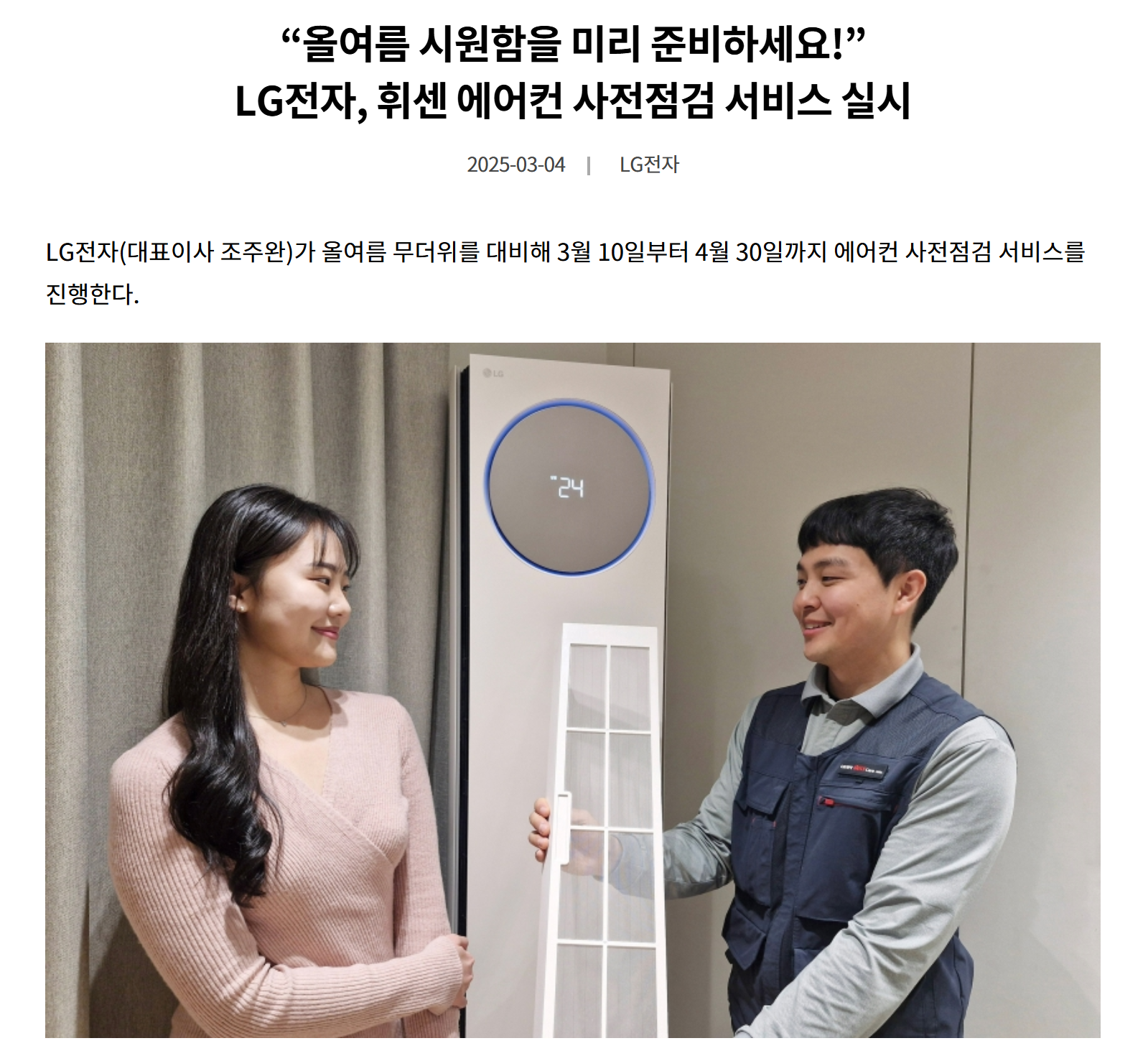 LG전자는 여름철을 맞아 고객들이 쾌적한 환경에서 에어컨을 사용할 수 있도록 사전점검 서비스를 제공합니다. 이 서비스는 에어컨의 성능을 점검하고, 필요한 경우 수리나 부품 교체를 지원하는 프로그램입니다. 특히, 사전점검을 통해 에어컨의 고장을 미리 예방할 수 있어 여름철에 시원한 바람을 누릴 수 있습니다.